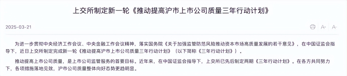 【環球網財經綜合報道】3月21日,上海證券交易所(以下簡稱“上交所”)發佈《推動提高滬市上市公司質量三年行動計劃(2024-2026)》(以下簡稱《計劃》),聚焦嚴監嚴管、投資價值、主體責任、生態共建及服務創新五大維度,全面升級資本市場高質量發展新引擎。這是繼前兩輪行動後,上交所第三次系統性推進上市公司質量提升工程。