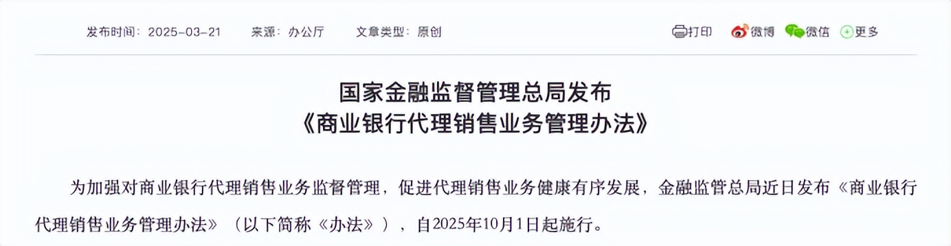 【環球網財經綜合報道】3月21日,國家金融監督管理總局發佈《商業銀行代理銷售業務管理辦法》(以下簡稱《辦法》),針對商業銀行代銷理財、保險、公募基金等金融產品的全流程建立統一監管標準。新規將於2025年10月1日實施。