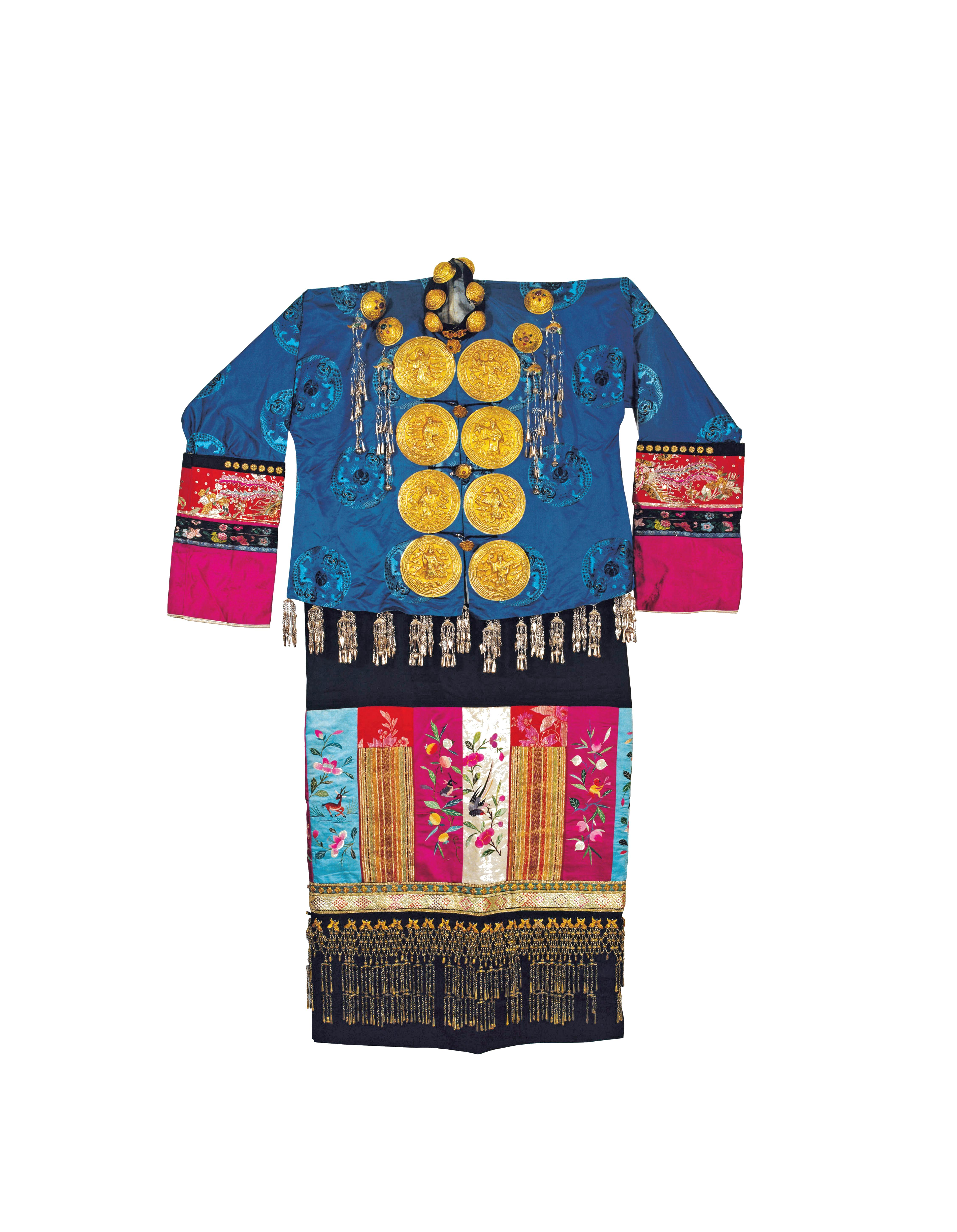 整套衣裙色彩搭配巧妙和諧、裝飾華麗