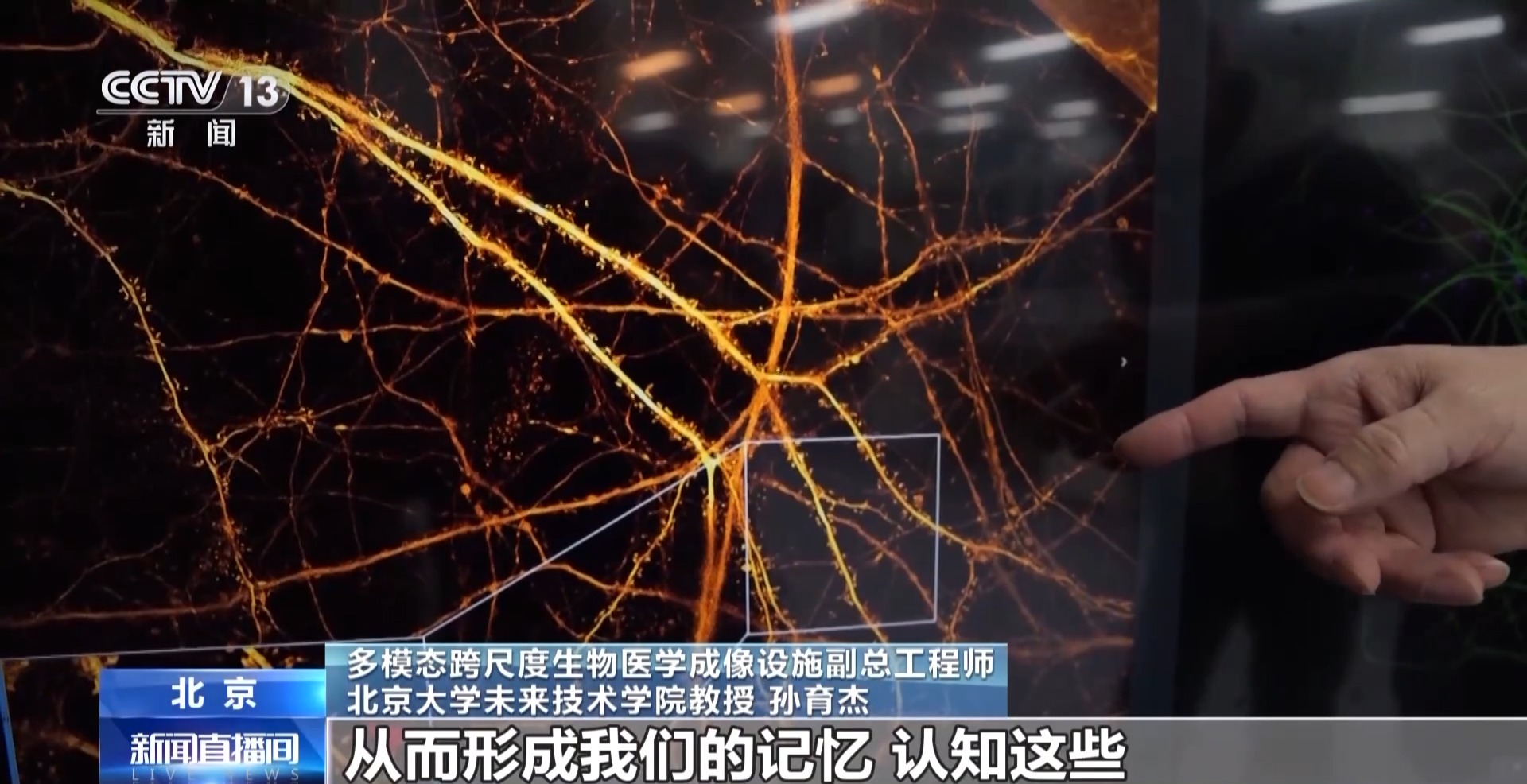 *多模態跨尺度生物醫學成像設施副總工程師 北京大學未來技術學院教授 孫育傑:*這套自研的熒光顯微鏡有非常高的分辨率,用來拍神經元細胞。神經元細胞很長,它會在旁邊生出來很多小點,就是所謂的突觸。這些神經細胞之間的連接就是靠這些突觸來連接的,從而形成我們的記憶、認知。人的大腦裏面有大概900億個神經元細胞,每個神經元細胞有1萬個連接,所以這是個極為複雜的系統。那這些神經元細胞是怎麼連接的,這個過程是怎麼發生的,這台顯微鏡就能夠向我們揭示。這麼高的分辨率,還能即時地看,這在以前是不太能想象到的。