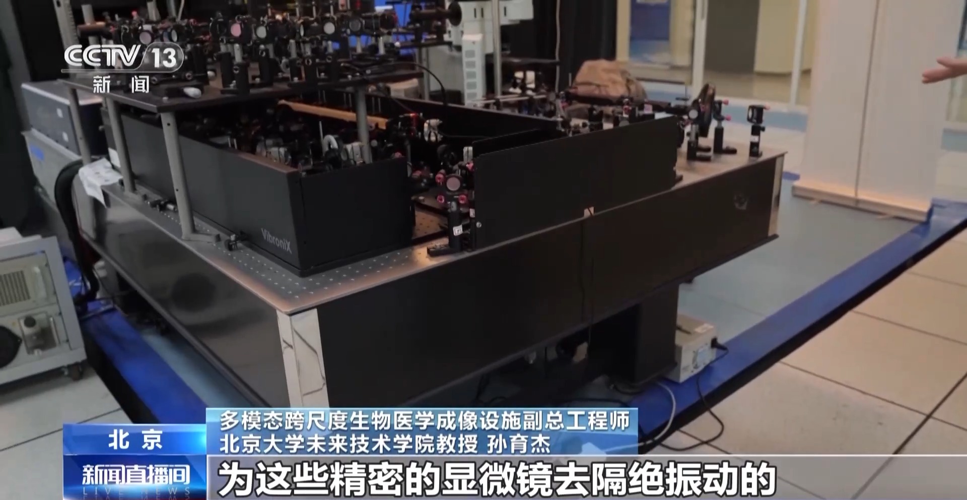 多模態跨尺度生物醫學成像設施副總工程師 北京大學未來技術學院教授 孫育傑:下面大的藍色區域,是為這些精密的顯微鏡隔絕振動而專門設計的,叫作大型氣浮平台。可以把0.5赫茲以下的振動都能隔絕掉,基本上是非常穩定的環境。