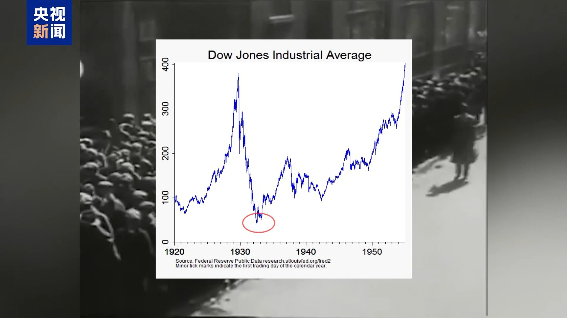 胡佛任期內,道瓊斯工業平均指數從1929年9月的約381的高點跌至1932年夏天的約41點,跌去了接近90%,直到1954年11月才回到崩盤前的高點。