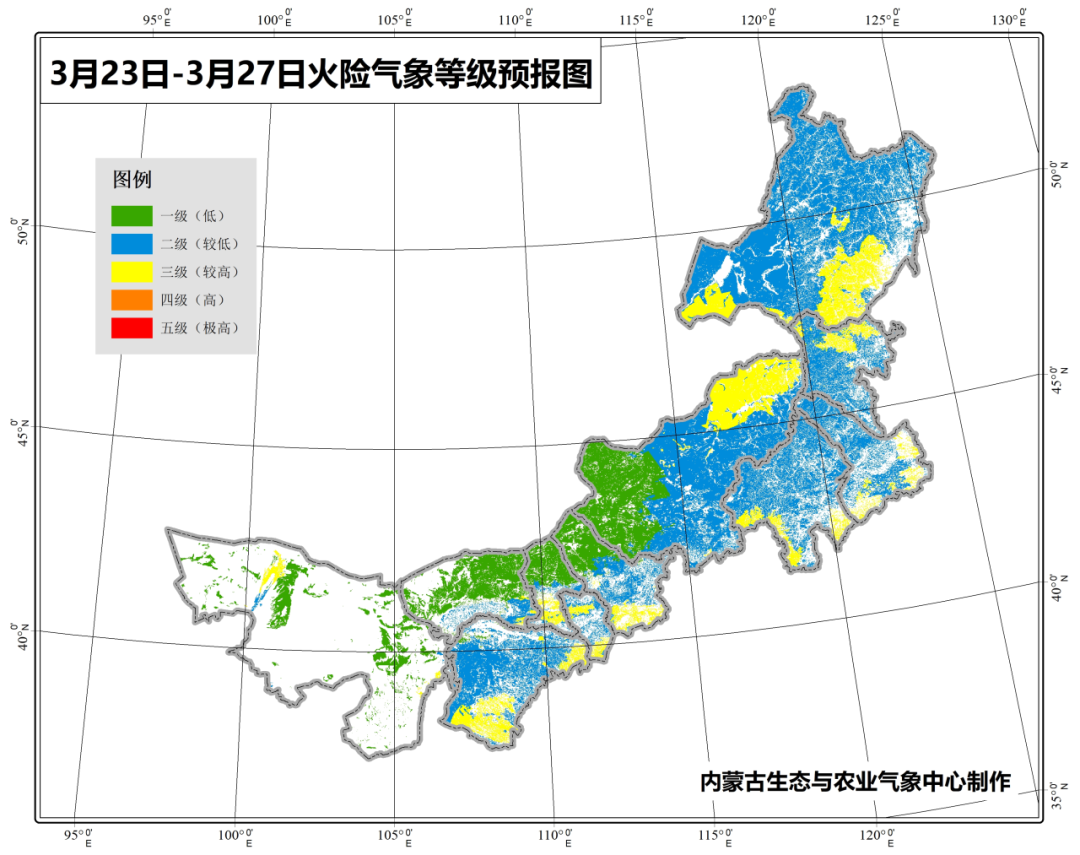預計未來5天(3月23日-3月27日)我區呼倫貝爾市東南部、興安盟北部、錫林郭勒盟東北部、通遼市南部部分地區、赤峯市西南部、烏蘭察布市南部、呼和浩特市南部、包頭市中南部、鄂爾多斯市東部和西南部以及大青山林區等地火險氣象等級較高,可燃物可燃燒、火情易蔓延(圖1)。目前我區農區自西向東逐漸進入春耕備耕階段,建議加強用火管理,預防人為火災發生及境外火災引發的入境火。