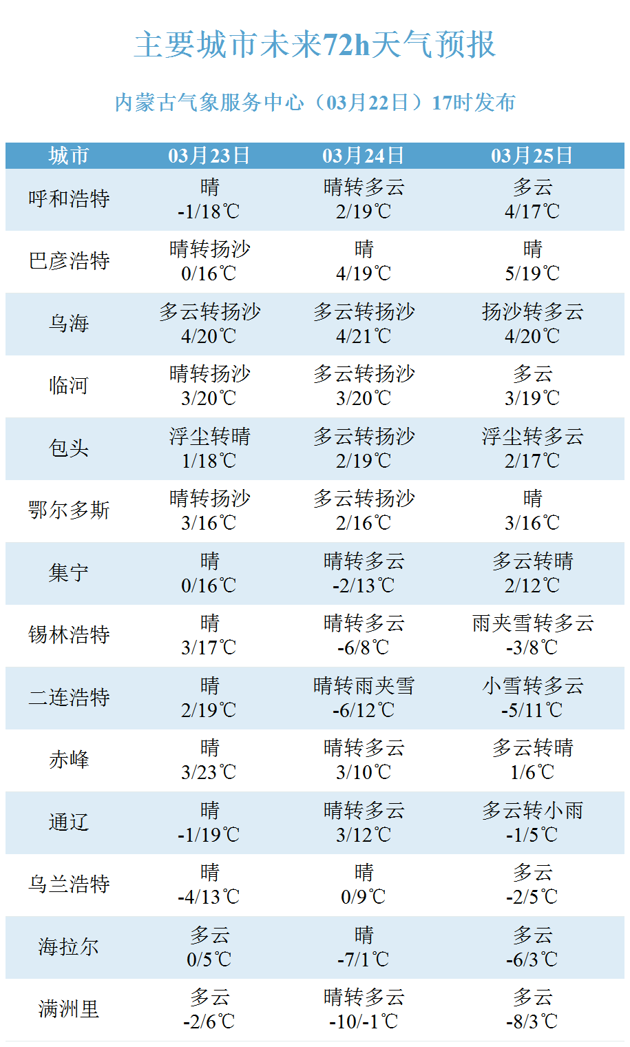 我區中部及東部大部地區多雲,烏蘭察布市東部至呼倫貝爾市南部偏南和北部偏北地區有小雨、雨夾雪或小雪,其餘地區晴間多雲;西部偏北、中部偏北和偏東、東部偏南地區5、6級短時7、8級偏西風或西北風,西部偏北局地有沙塵天氣;西部偏西北地區氣温下降4~6℃,局地氣温下降6℃以上。