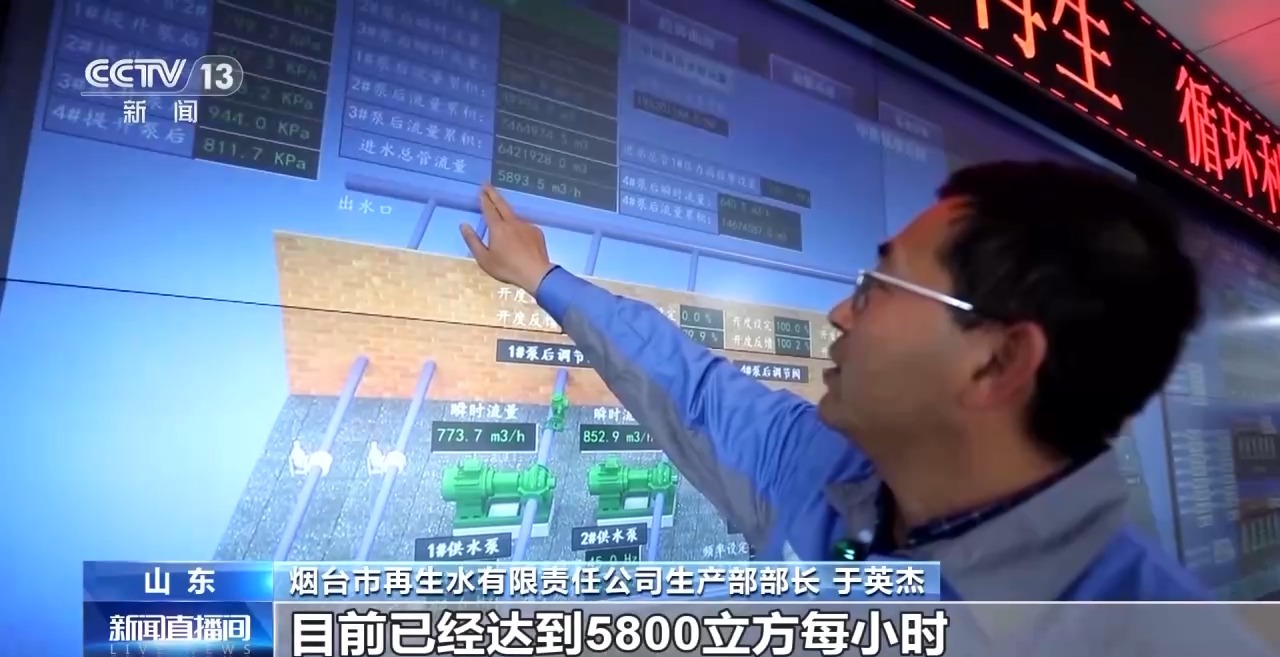 *煙台市再生水有限責任公司生產部部長 於英傑:*萬華工業園區供水的即時流量顯示,目前已經達到5800立方/小時,全天累計14.5萬立方。