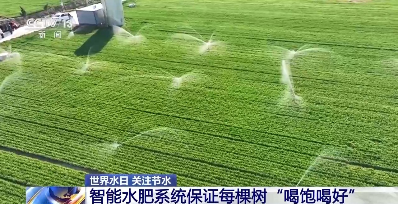 同在山西省運城市的萬榮縣,是著名的蘋果產區。智能水肥系統通過密佈田壟的滴灌管網,可以精準輸送水和養分,讓澆地變為澆樹,雖然地裏看不見水,但是每棵樹卻都可以“喝飽喝好”。這種春澆模式,讓單次澆水的節水效率達到90%左右。