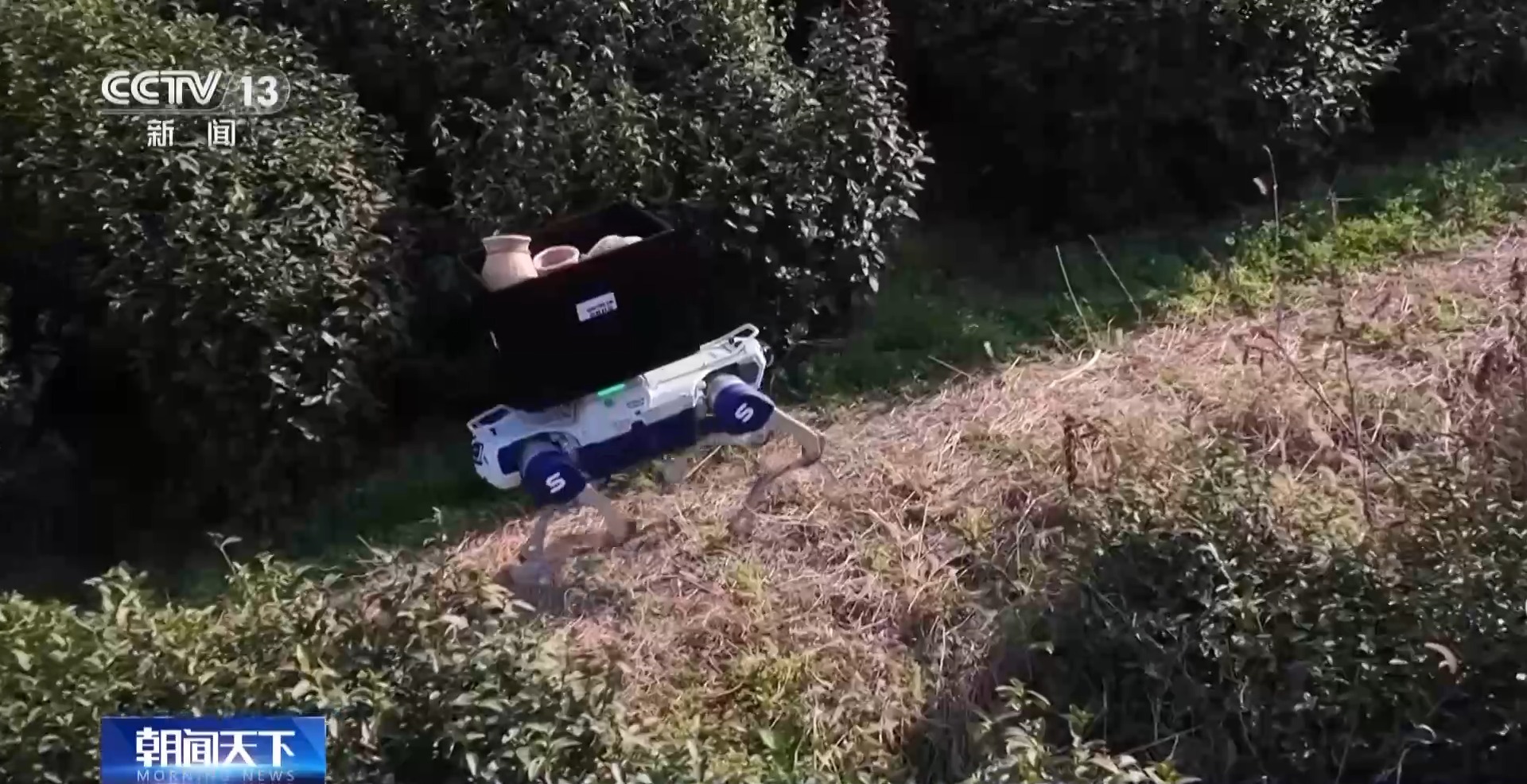 在徑山的茶山上,小朋友們正在茶農的指導下體驗“小小採茶工”的工作,一片片茶芽被陸續放進茶簍中,再由“機器狗”馱着茶簍穩穩行走在崎嶇的山路上,護送這些新葉快速到達炒茶車間。