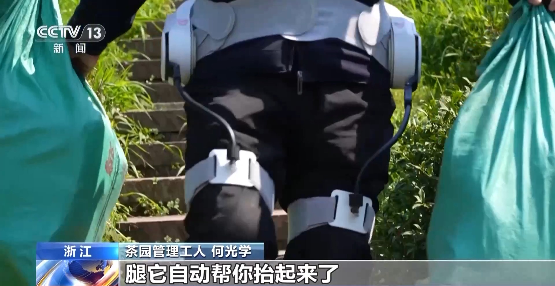 走進龍井村茶園記者發現,45歲的茶園管理工人何光學正穿戴着髖部助行外骨骼設備上山工作,根據他的身高、體重和步態特徵等自動設置出個性化助力方案,讓每天多次往返茶園進行茶園養護、運茶青的他,工作起來“省力”不少。
