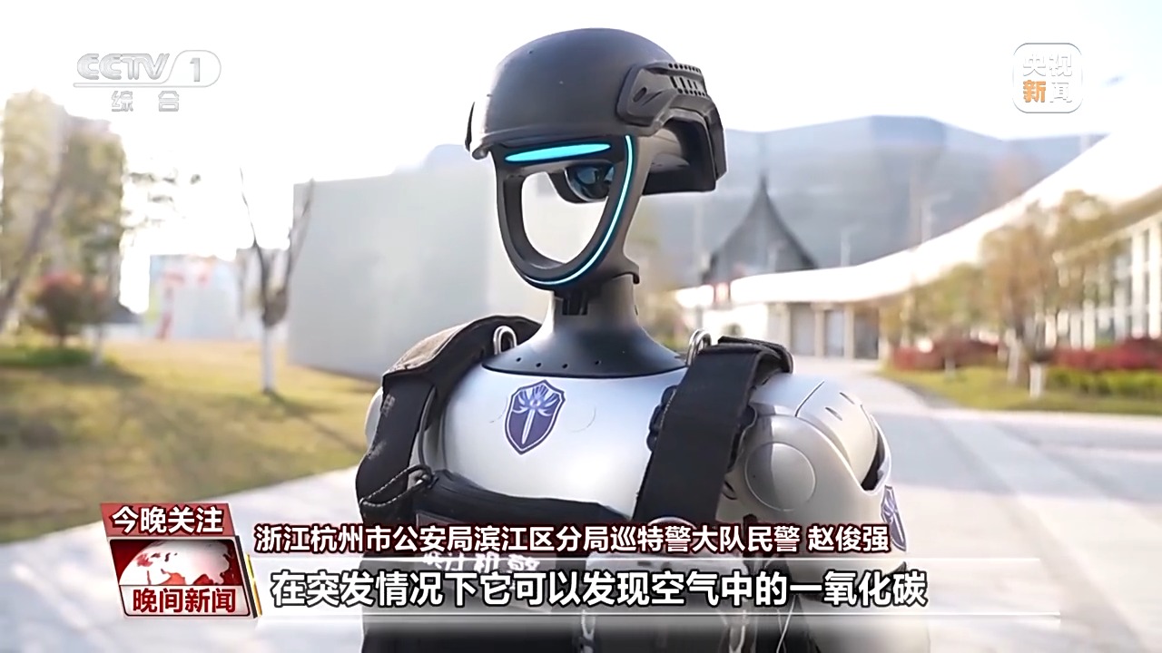 *浙江杭州市公安局濱江區分局巡特警大隊民警 趙俊強:*在日常巡邏中,它配備了防爆安檢的功能,同時它還可以跟着我們民警進行武裝巡邏,在羣眾服務上面,它可以為羣眾提供一些應急類的,以及求助類的一些服務。它還搭載了空氣檢測儀,在突發情況下,它可以發現空氣中的一氧化碳,以及硫化氫等有害氣體的濃度,如果濃度超標,它就會及時發現報警。