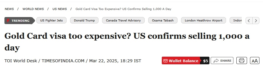 移民金卡定價500萬美元