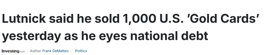 綜合財經新聞網站“Investing”、《印度時報》等外媒報道,美國商務部長盧特尼克當地時間20日在一檔博客中談及美國此前推出的移民“金卡”項目,稱他在一天之內就售出了1000張移民“金卡”。報道指出,此舉旨在幫助償還美國國債。