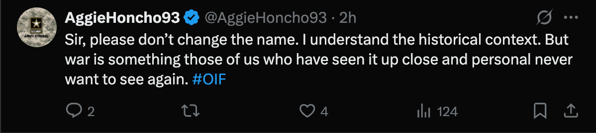 還有網友説,“先生,請不要改名。我理解歷史背景。但戰爭是我們這些親眼目睹過戰爭的人永遠不想再看到的東西”。↓