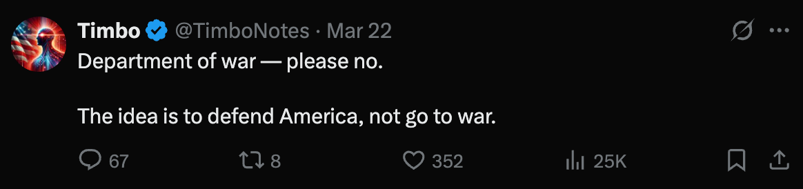 有網友表示,“戰爭部——請不要這麼做。我們的想法是保衞美國,而不是發動戰爭”。↓