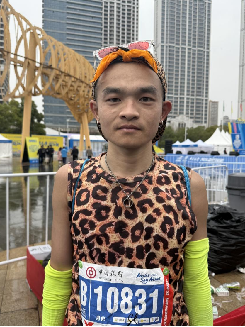 在全程馬拉松項目的終點處,一位選手身着豹紋背心,頭戴豹紋鴨舌帽,十分吸睛。這位來自吉林長春的肖先生稱,穿豹紋服飾,既是為了增加辨識度,也是為了配合此次武漢馬拉松的主題色。