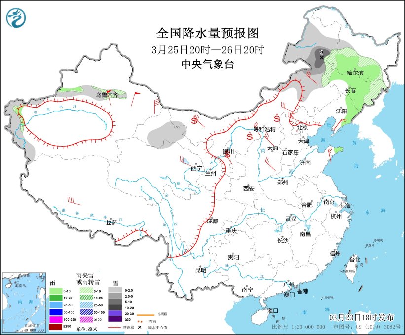 *3月25日20時至26日20時,*新疆沿天山地區、甘肅北部、內蒙古東部、黑龍江中部、吉林東部等地部分地區有小到中雪或雨夾雪,局地有大雪。黑龍江南部、吉林中西部、遼寧東部等地部分地區有小雨。新疆北部、西北地區中東部、內蒙古大部、遼寧大部、華北北部和西部等地部分地區有4~6級風,新疆山口地區陣風風力8~9級。內蒙古中西部、寧夏等地部分地區有揚沙,局地有沙塵暴(見圖3)。