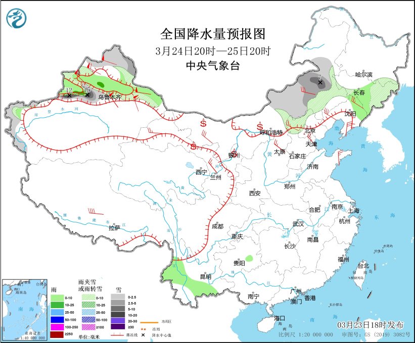 *3月24日20時至25日20時,*新疆阿勒泰及沿天山高海拔地區、內蒙古中部和東南部、吉林東部、河北西北部等地部分地區有小到中雪或雨夾雪,新疆沿天山地區、內蒙古東南部局地有大到暴雪(10~15毫米)。新疆北部、吉林南部、遼寧東北部、雲南西部等地部分地區有小雨,局地中雨。新疆北部、甘肅大部、內蒙古大部、遼寧大部、華北北部等地部分地區有4~6級風,新疆山口地區陣風風力9~10級。內蒙古中西部、甘肅河西、寧夏等地部分地區有揚沙,局地有沙塵暴(見圖2)。