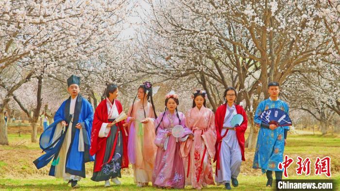 庫車杏花綻放,遊人身着古裝漫步杏園。(資料圖)庫車市融媒體中心供圖