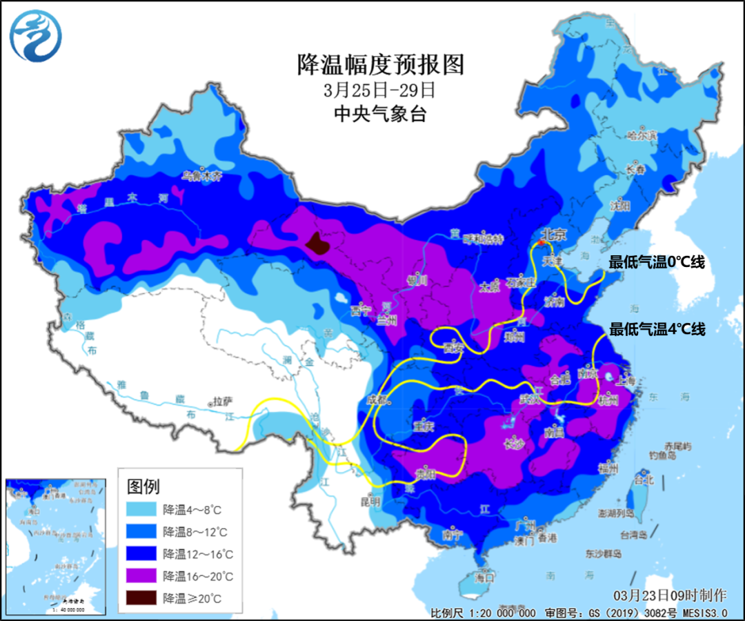 預計3月25日至29日,除青藏高原外,全國大部地區氣温先後下降8~12℃,西北地區東部、華北西部、黃淮南部、江淮、江南等地降温幅度可達14~16℃,局部地區日最高氣温降幅超過20℃。降温過後,30日早上最低氣温0℃線將位於華北中部至陝西南部一帶;華北地區日最高氣温在10~15℃。