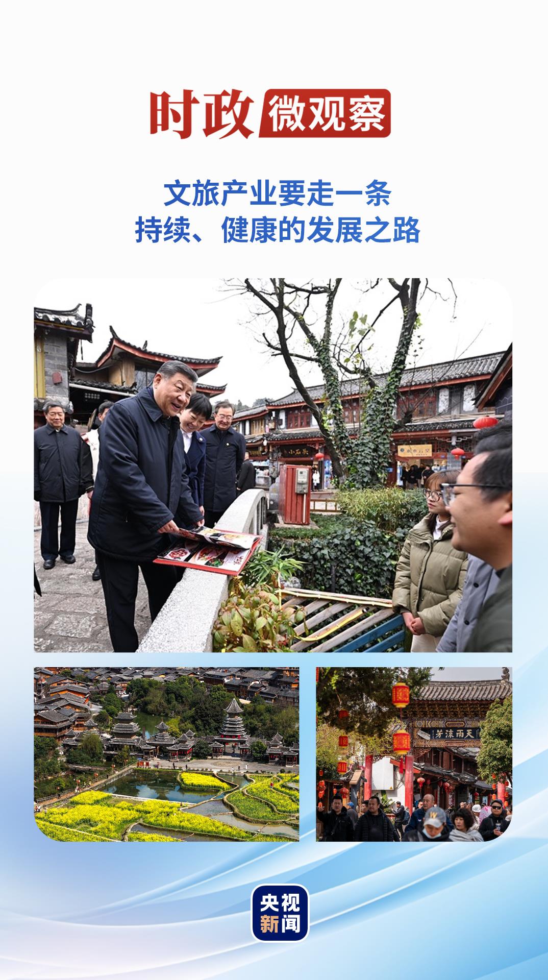 在雲南麗江古城,總書記沿着石板路邊走邊看,與居民和遊客親切交流:“麗江有美麗風光,有特色文化,有很高知名度,一定能走出一條持續健康的文旅發展之路。”他要求當地處理好保護和發展的關係,讓這座美麗的古城煥發新的光彩。