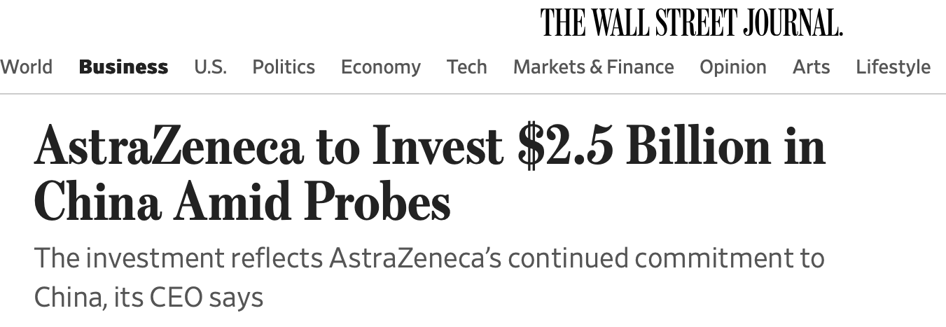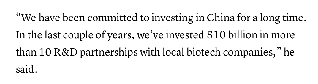 報道指出,長期以來,這家跨國公司一直致力於在中國投資。在過去的幾年裏,與當地10多家生物技術公司建立了研發合作伙伴關係,投資額達100億美元。