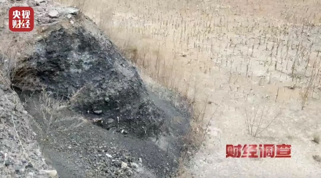 隨後,記者跟隨村民來到這個煤矸石填埋場附近的水溝,*眼下正是枯水期,水溝已乾涸斷流,但這道黑色淤泥“疤痕”,依然清晰可見。*這條黑色的水溝從煤矸石填埋場流出,直通村裏的水道。而這個村莊距離黃河一級支流——汾河僅有300米的距離。