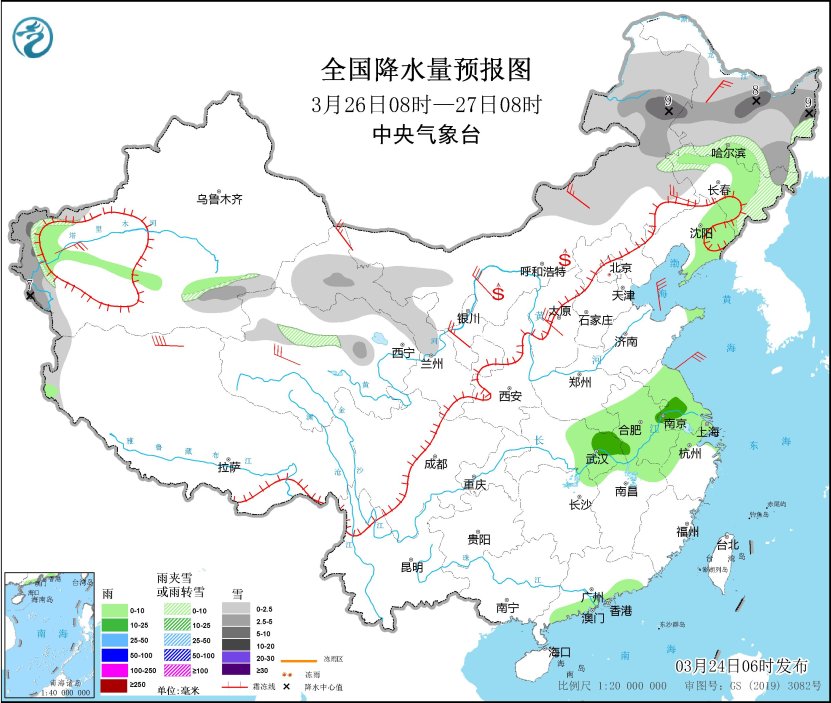 *3月25日08時至26日08時,*新疆沿天山地區、內蒙古西北部和東部、吉林大部、甘肅河西等地部分地區有小到中雪或雨夾雪,其中,吉林東部、新疆南疆西部山區、甘肅北部等地部分地區有大雪(5~8毫米)。新疆伊犁河谷、內蒙古中部、吉林中部、遼寧東部、河北北部、湖南西部、貴州東北部、雲南西北部和東南部等地部分地區有小雨。內蒙古中西部、遼寧西部、山東半島、新疆東部、甘肅北部等地部分地區有4~6級風,新疆山口地區陣風風力8~9級。內蒙古中西部、甘肅河西、寧夏等地部分地區有揚沙(見圖2)。