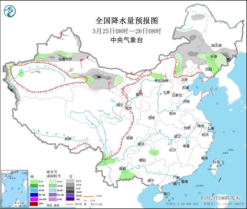 *3月24日08時至25日08時,*新疆北部和沿天山地區、內蒙古東部、黑龍江西北部、吉林西北部和東部、河北北部等地部分地區有小到中雪或雨夾雪,其中,新疆阿勒泰和沿天山高海拔地區、內蒙古東部等地部分地區有大到暴雪(10~15毫米)。新疆沿天山地區和伊犁河谷、內蒙古東南部和西北部、遼寧北部、華北北部、西南地區南部和東部等地部分地區有小雨,其中,新疆伊犁河谷等地部分地區有中到大雨。內蒙古中西部、山西北部、河北北部、黑龍江西部、山東半島、新疆北部等地部分地區有4~6級風。內蒙古西部、寧夏北部等地部分地區有揚沙或浮塵,局地有沙塵暴(見圖1)。