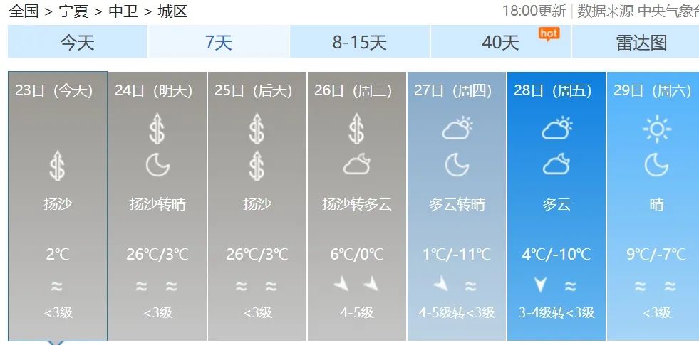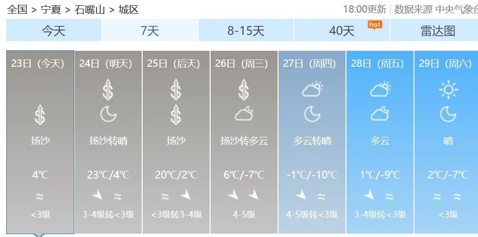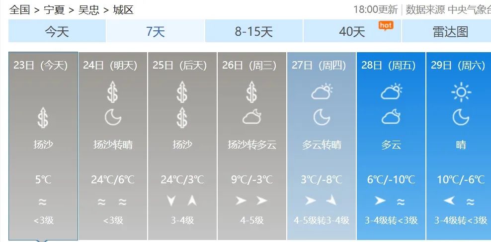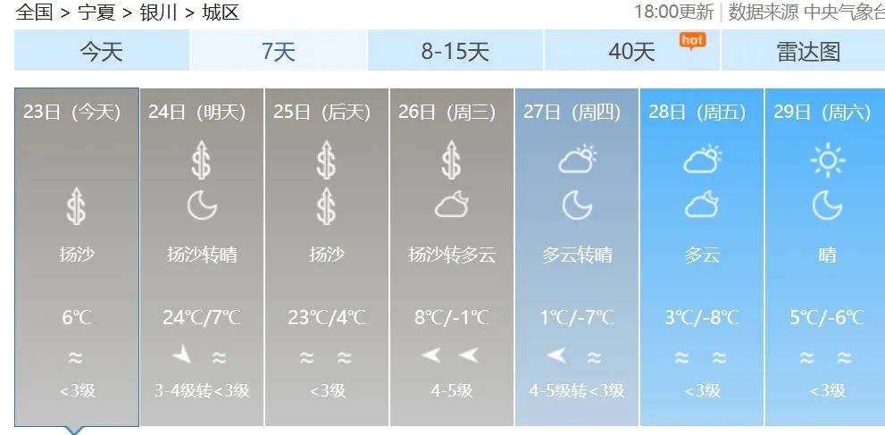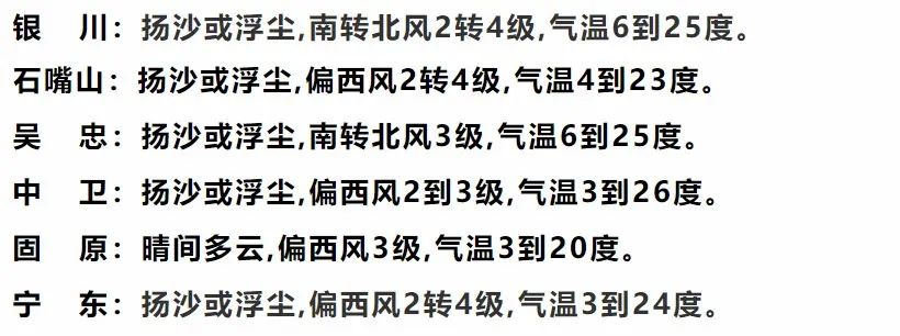 預計未來三天,多風沙天氣,24-25日氣温持續上升。其中,23日夜間,全區有浮塵(能見度3~9千米);24日白天,銀川、石嘴山兩市及鹽池縣有4~5級偏北風,陣風7~9級,並伴有沙塵天氣(能見度1~7千米);