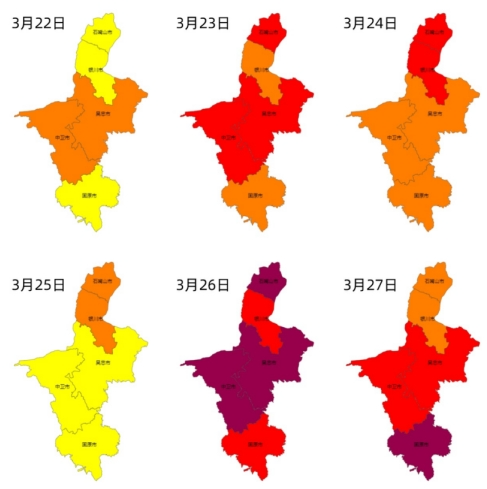 寧夏生態環境廳與寧夏氣象局綜合分析預測,3月22日—24日、3月26日—27日,受多波次、較強沙塵天氣過程影響,全區大部地區將出現以PM10為首要污染物的重度及以上污染時段,具體預報如下: