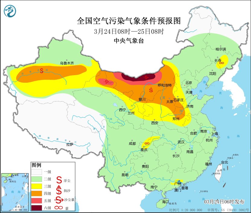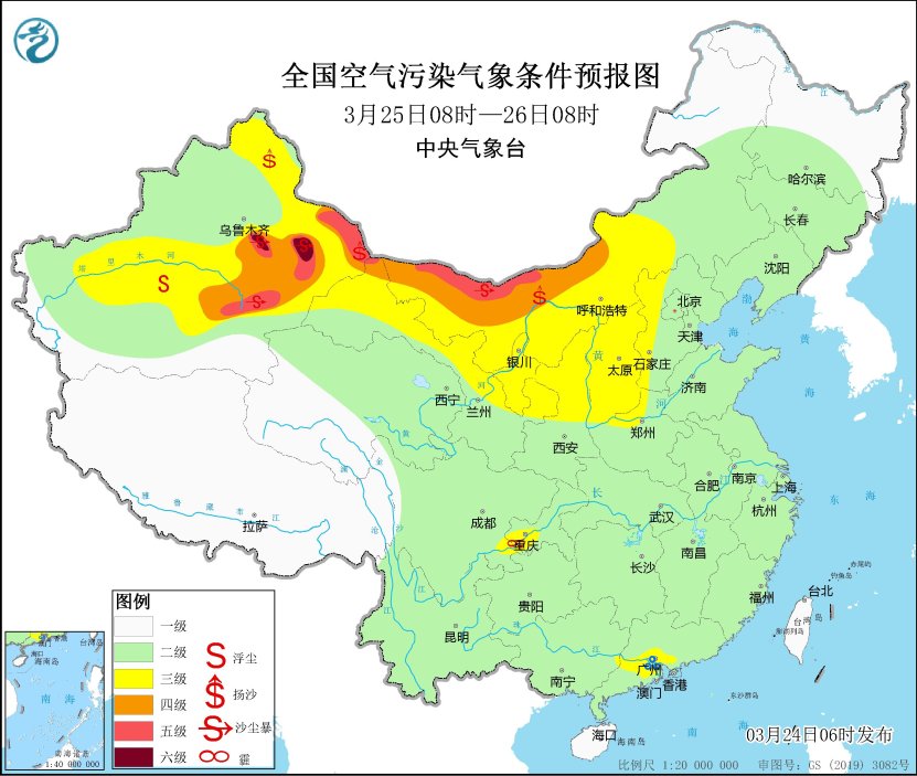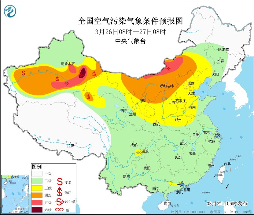 受傳輸影響,24日夜間至25日上午,區域大部有浮塵天氣;26日至27日上午,沙塵天氣強度增大,區域大部將有揚沙或浮塵天氣。