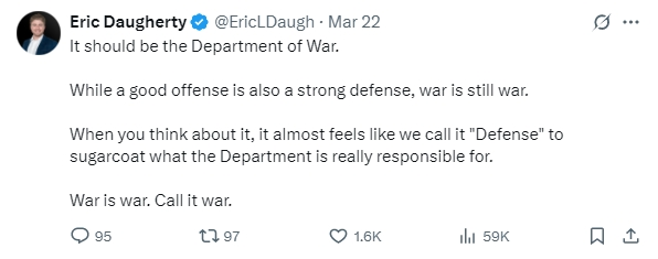 另一位支持改名的用户表示,應該使用“戰爭部”。“雖然好的進攻也是強大的防禦,但戰爭就是戰爭。*仔細想來,會感覺我們稱之為‘國防’是為了粉飾這個部門真正負責的事情。*戰爭就是戰爭。改成戰爭部吧。”