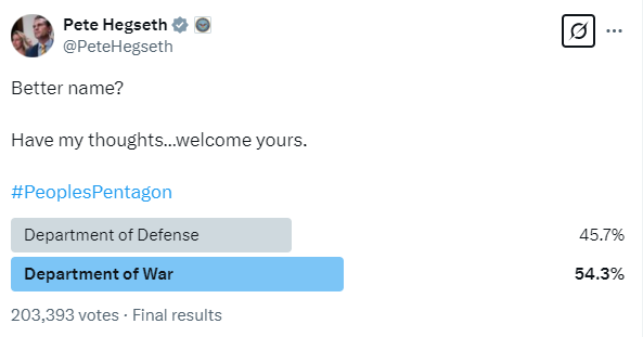 近日,美國國防部長赫格塞思在社交媒體平台X上發起投票,邀請網民發表有關國防部新名稱的想法,選項分別是*“國防部”和“戰爭部”*。