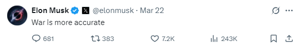 美國政府效率部負責人、特斯拉創始人兼首席執行官馬斯克回覆帖文稱:“戰爭一詞更準確。”