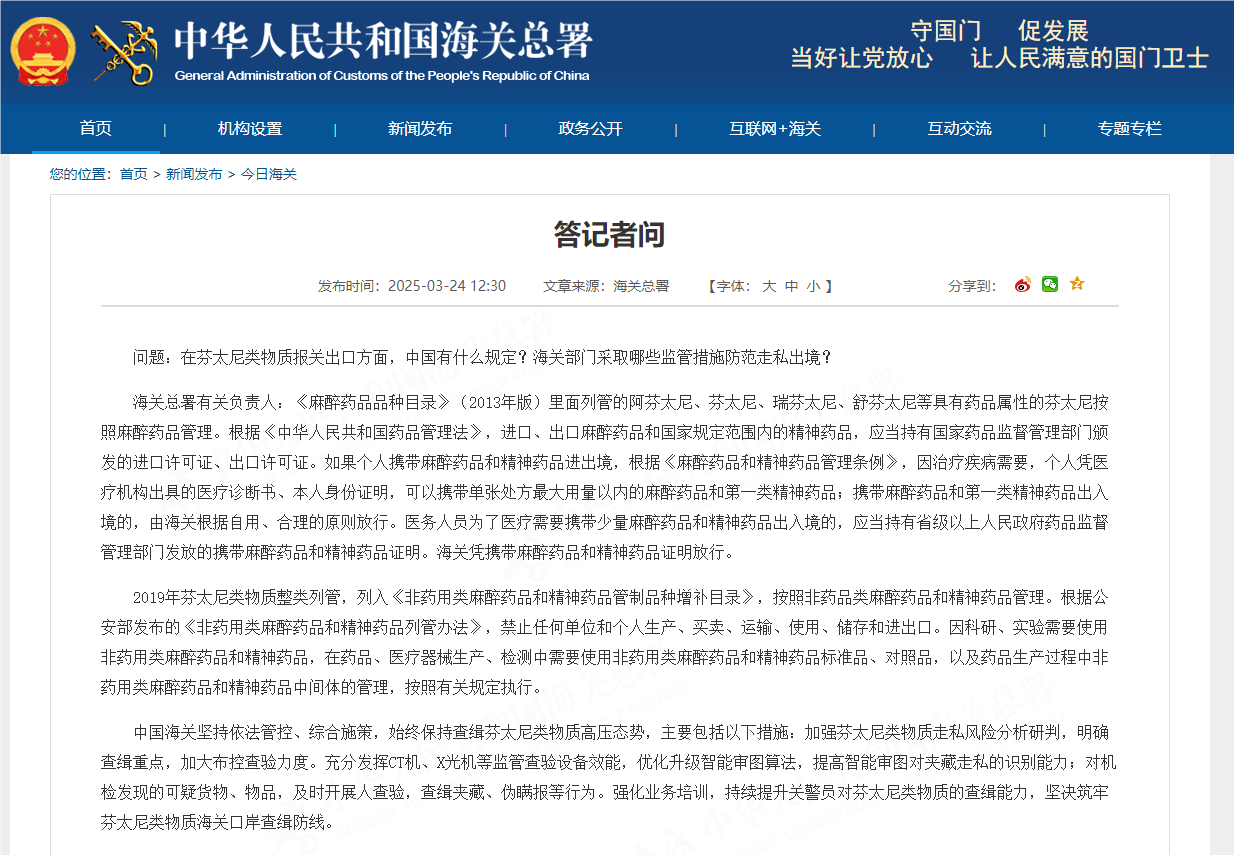 在芬太尼類物質報關出口方面,中國有什麼規定?海關總署回應