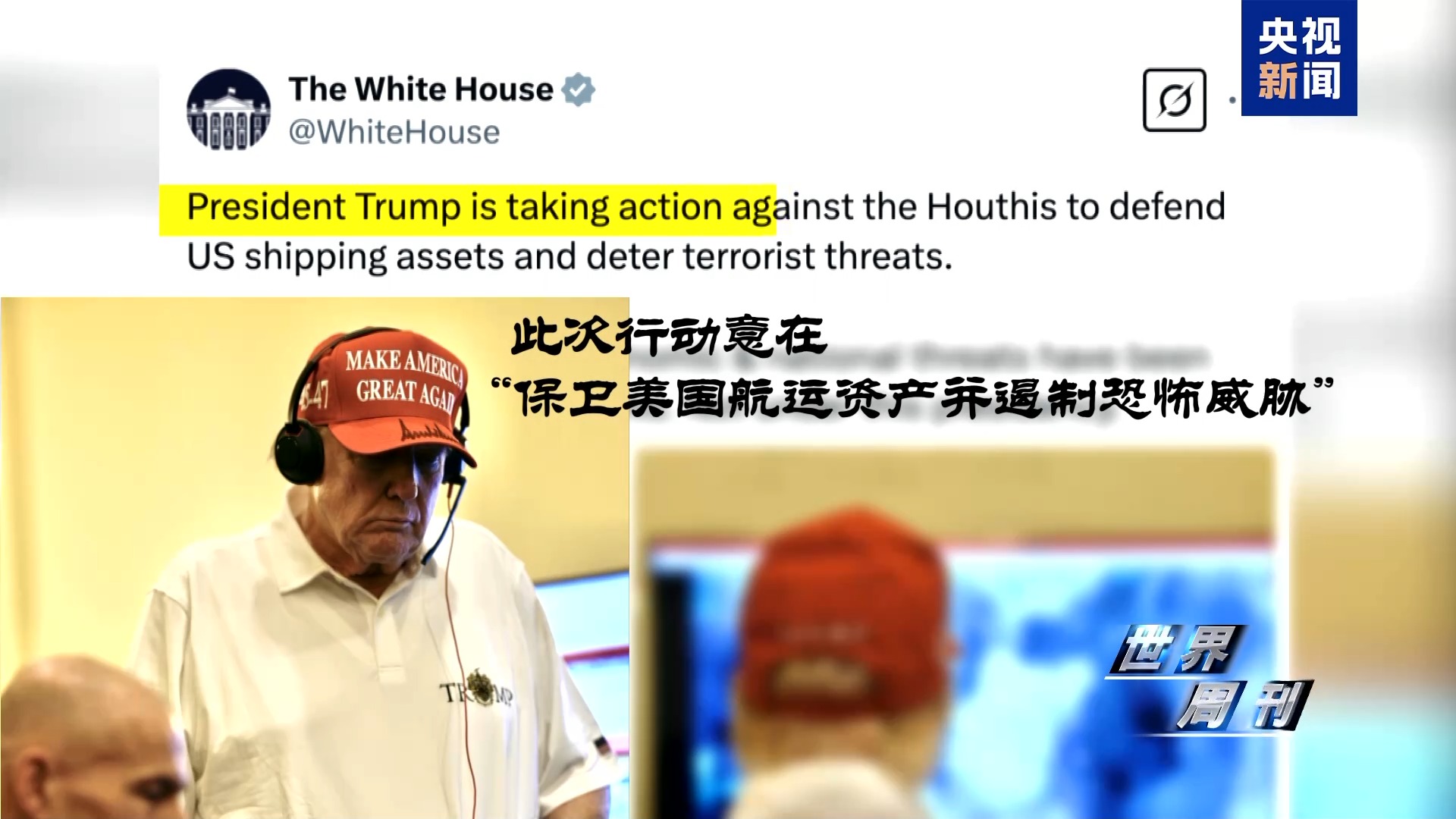 當天,白宮官方賬號在社交媒體X上發佈了兩張特朗普的“觀戰”照片,照片中,特朗普穿着高爾夫球衫,戴一頂寫有“讓美國再次偉大”的紅色帽子。還配了這樣一句話:此次行動意在“保衞美國航運資產並遏制恐怖威脅”。