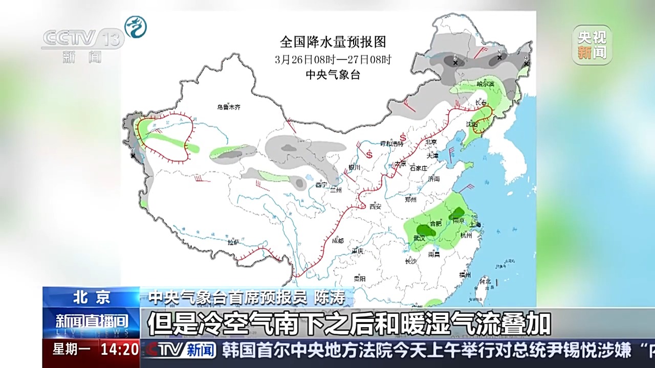 *中央氣象台首席預報員 陳濤:*北方地區的雨雪天氣相對來説就比較分散,主要是在新疆、內蒙古以及東北地區將會出現小到中雨雪或者是雨夾雪的天氣,但是冷空氣南下之後和暖濕氣流疊加,從26日以後,南方的大部分地區將會出現小到中雨或者雷陣雨,局部地區可能還是要防範可能出現的雷暴大風或者冰雹等強對流天氣。