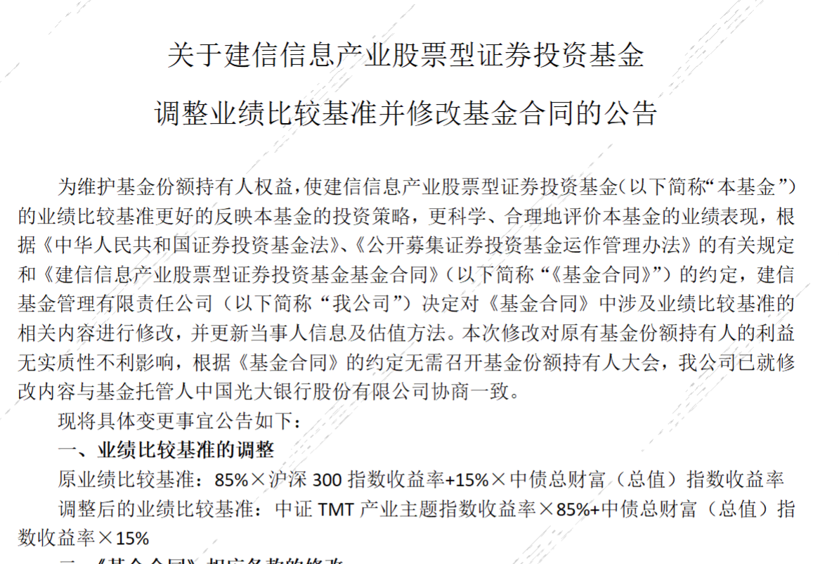 【環球網金融綜合報道】日前,建信基金髮布公告,調整信息產業股票型證券投資基金的業績比較基準。原業績比較基準為85%×滬深300指數收益率+15%×中債總財富(總值)指數收益率,調整後的業績比較基準為中證TMT產業主題指數收益率×85%+中債總財富(總值)指數收益率×15%。
