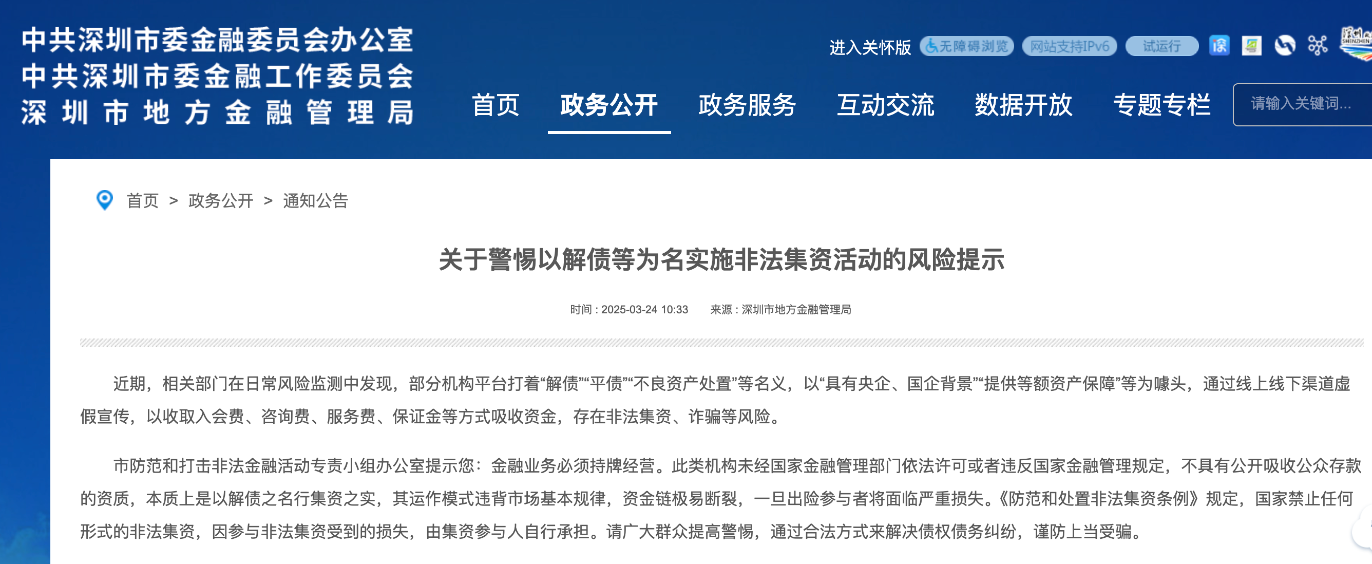 【環球網金融綜合報道】3月24日,深圳市地方金融管理局發佈《關於警惕以解債等為名實施非法集資活動的風險提示》表示,近期,相關部門在日常風險監測中發現,部分機構平台打着“解債”“平債”“不良資產處置”等名義,以“具有央企、國企背景”“提供等額資產保障”等為噱頭,通過線上線下渠道虛假宣傳,以收取入會費、諮詢費、服務費、保證金等方式吸收資金,存在非法集資、詐騙等風險。