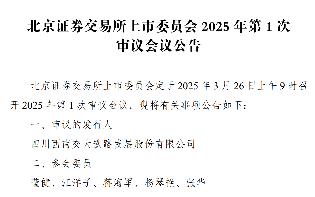【環球網金融綜合報道】日前,北交所上市委員會發布公告,宣佈將於3月26日上午9時召2025年第1次審議會議,審議四川西南交大鐵路發展股份有限公司(簡稱“交大鐵發”)的IPO申請。