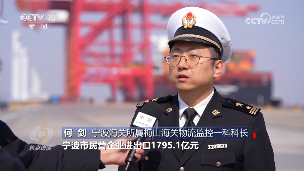 寧波海關所屬梅山海關物流監控一科科長何劍:“1月到2月,寧波市民營企業進出口1795.1億元,同比增長11.3%,佔寧波市進出口總值的76.8%。”