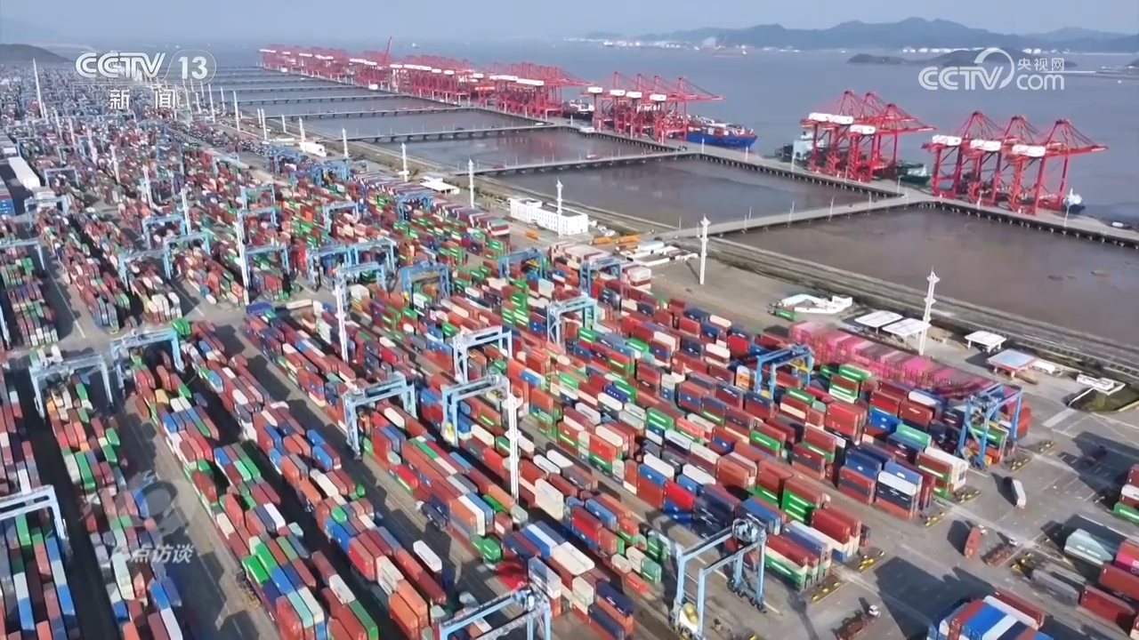 在寧波舟山港梅山港區,滿載着集裝箱的遠洋貨輪整裝待發。工作人員告訴記者,今年開年以來,碼頭一直非常繁忙。