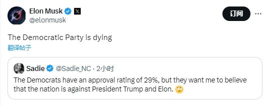 馬斯克隨後轉發了這條帖文,並評論稱“民主黨正在死亡”。