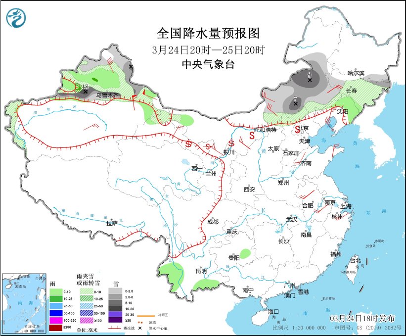 *3月24日20時至25日20時,*內蒙古東部、吉林大部、河北北部、新疆北部等地部分地區有小到中雪或雨夾雪,其中,內蒙古東部、新疆沿天山地區等地部分地區有大到暴雪(10~18毫米)。新疆伊犁河谷和北疆盆地、遼寧北部和東部、雲南南部和西部等地部分地區有小到中雨。新疆北部、內蒙古中西部、遼寧中西部、西藏北部、青海西部、河北北部、北京大部、天津大部、山東北部和半島地區等地有5~6級風,其中,新疆北部局地有7~9級風;渤海、渤海海峽、黃海北部和中部海域將有7~8級風、陣風9級(見圖3)。