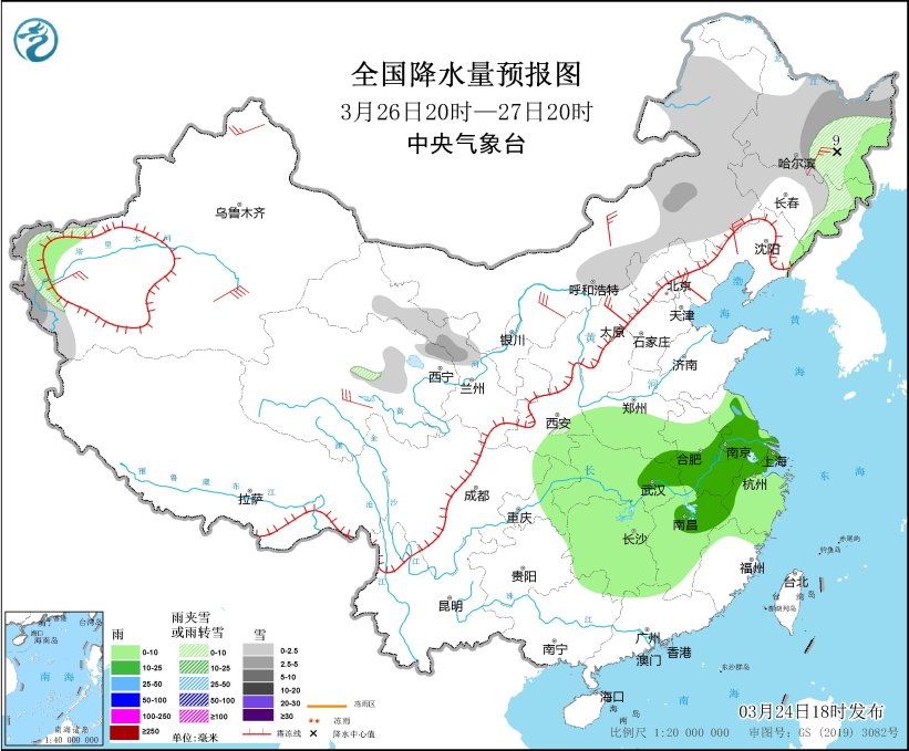 *3月26日20時至27日20時,*內蒙古東部、黑龍江大部、吉林北部和西部、新疆南疆西部山區、青海東部、甘肅河西等地部分地區有小到中雪或雨夾雪。黃淮西部、江淮大部、江漢、江南大部、重慶東部等地部分地區有小到中雨,其中,江蘇中北部等地部分地區有大雨。內蒙古河套地區和中部、東北地區、新疆北疆北部和南疆盆地、甘肅中部、青海南部等地部分地區有4~6級風,其中,新疆南疆盆地部分地區有6~7級風(見圖5)。