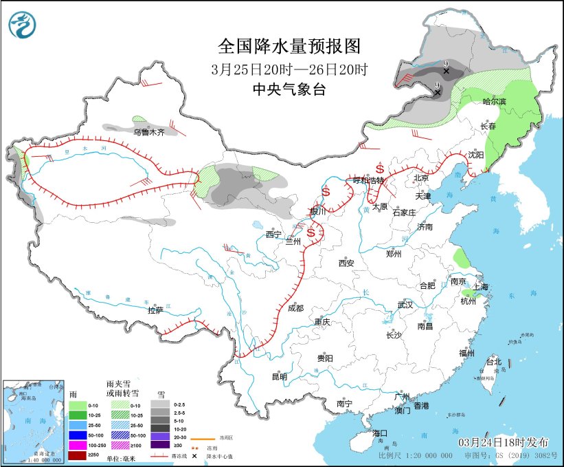 *3月25日20時至26日20時,*內蒙古中東部和西北部、黑龍江中西部、新疆沿天山地區和南疆西部山區、西北地區中部等地部分地區有小雪或雨夾雪,其中,內蒙古東北部、新疆南疆西部山區、甘肅河西等地部分地區有中到大雪(5~9毫米)。東北地區東部等地部分地區有小雨。內蒙古中東部、新疆沿天山地區等地部分地區有4~6級風,其中,內蒙古東北部、新疆南疆盆地等地部分地區有6~7級風(見圖4)。