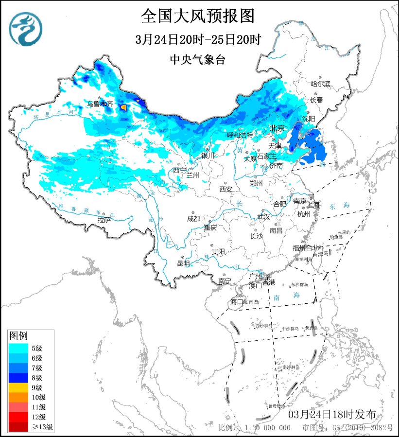 預計,3月24日20時至25日20時,新疆北部、內蒙古中西部、遼寧中西部、西藏北部、青海西部、河北北部、北京大部、天津大部、山東北部和半島地區等地有5~6級風、陣風7~9級,其中,新疆北部局地有7~9級風、陣風10~11級;渤海、渤海海峽、黃海北部和中部海域將有7~8級風、陣風9級。
