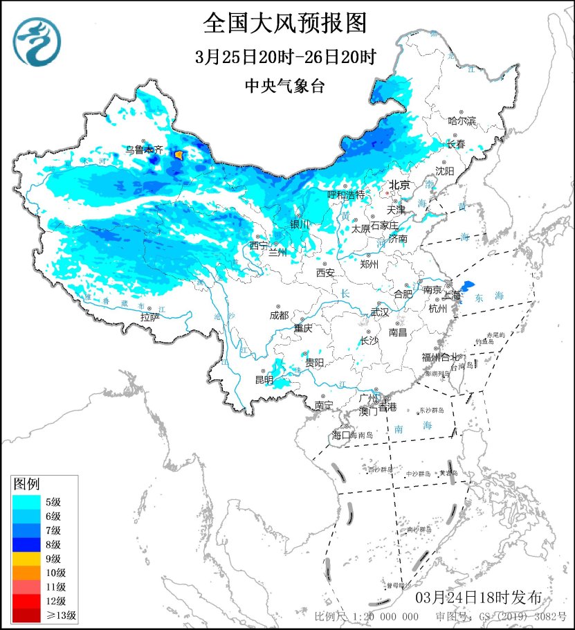 預計,3月25日20時至26日20時,新疆北疆東部和南疆盆地、內蒙古大部、甘肅西部、寧夏大部、陝西北部、西藏中西部、青海中西部、河北北部等地有5~6級風、陣風7~9級,其中,新疆北疆東部局地有7~8級風、陣風9~10級。