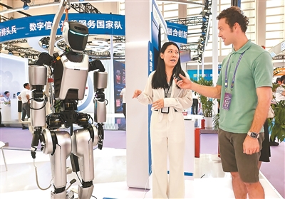 在浙江省寧波國際會展中心的第十四屆智博會現場,一位外國朋友採訪人形機器人展商。
