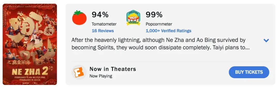 不僅打破了多項票房紀錄,*《哪吒2》更以**IMDb評分8.2分、爛番茄新鮮度94%、爆米花指數99%*的口碑,讓世界看見中國電影的工業實力與文化魅力。