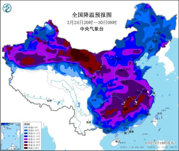 預計,3月24日20時至3月30日08時,新疆、西北地區大部、內蒙古、東北地區、華北地區、黃淮、江南、華南大部以及西南地區東部等地將先後降温8~14℃,其中,內蒙古西部、新疆北疆東部和南疆盆地、甘肅大部、寧夏大部、黃淮西部、江淮中西部、江漢大部、江南中北部、貴州中東部等地部分地區降温可達16~18℃,局地降温超過20℃。